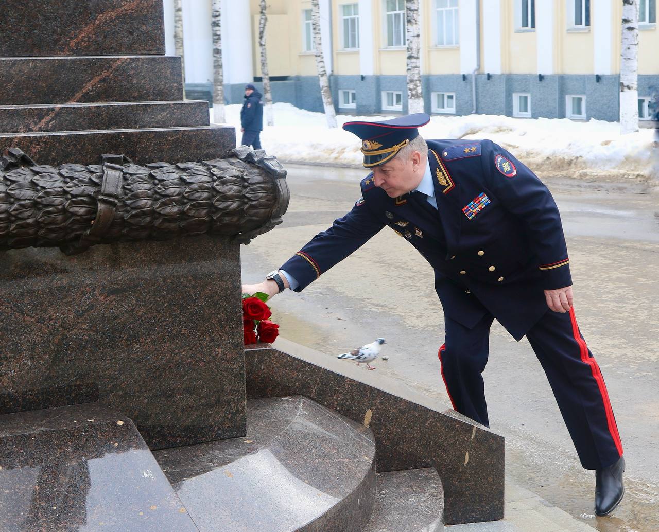В начале встречи руководитель подразделения Центрального аппарата МВД России генерал-лейтенант внутренней службы Александр Авдейко и министр внутренних дел по Республике Коми генерал-майор полиции Андрей Сицский возложили цветы к мемориалу у здания регионального МВД «Шагнувшим в бессмертие», почтив память сотрудников органов внутренних дел, погибших при исполнении служебных обязанностей в разные годы.