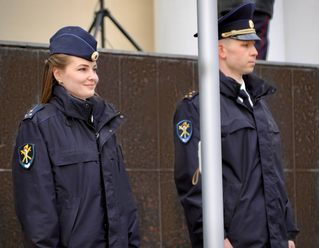 Флаг МВД России было доверено поднять майору юстиции Екатерине Родиной и капитану юстиции Роману Ермолину.