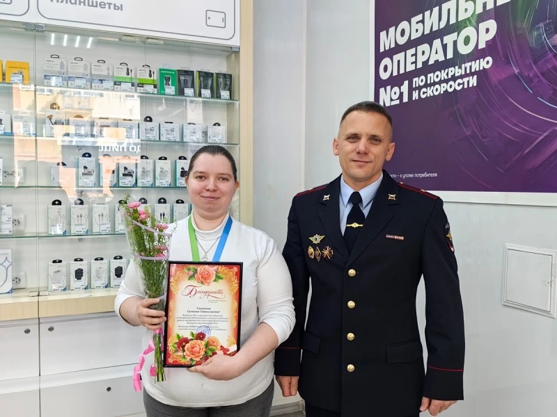 Врио заместителя начальника ОМВД России «Воркутинский» Иван Пимкин навестил бдительную сотрудницу салона связи – Светлану Бажину – по месту работы и вручил ей благодарственное письмо за неравнодушие и активную гражданскую позицию.