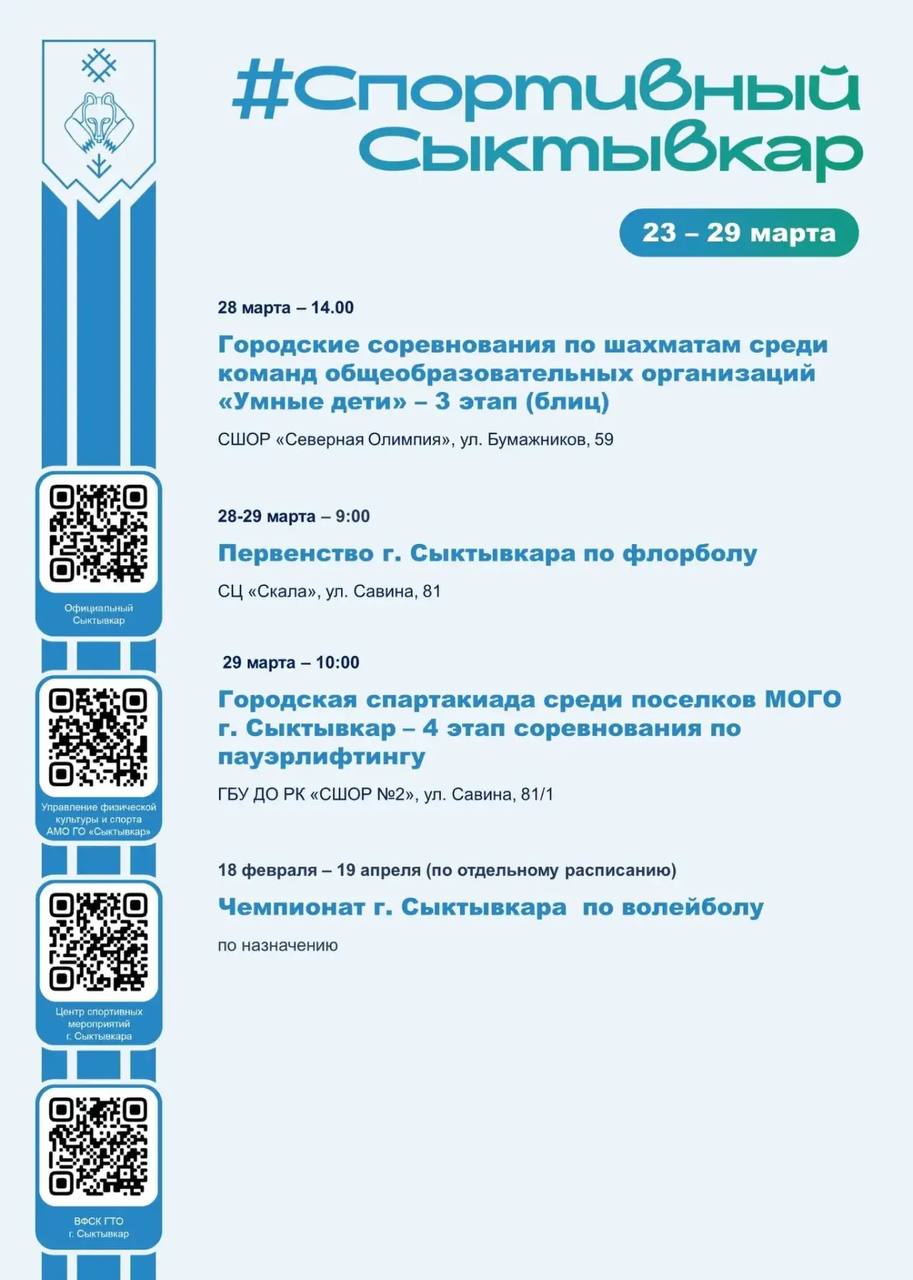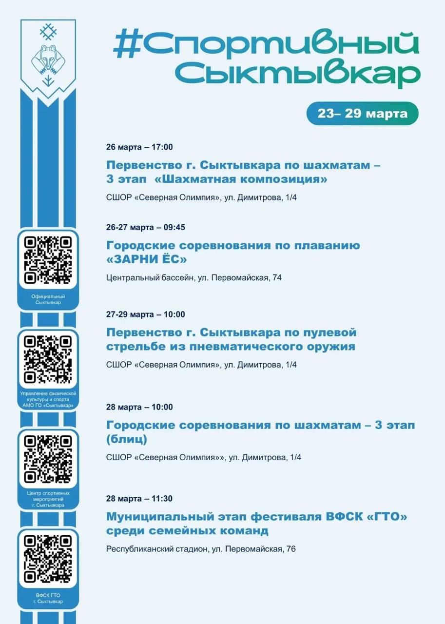 На этой неделе Сыктывкар снова дышит спортом. Каждый найдёт что-то для себя: шахматы, плавание, стрельба, флорбол, пауэрлифтинг, семейный ГТО. Выбирайте, приходите, болейте за наших.