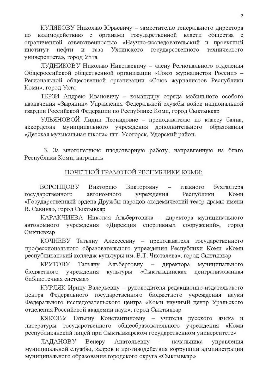 Почётной грамотой Республики Коми отмечены работники культуры, образования, спорта, социальной защиты, энергетики, финансовой сферы и других важных направлений.
