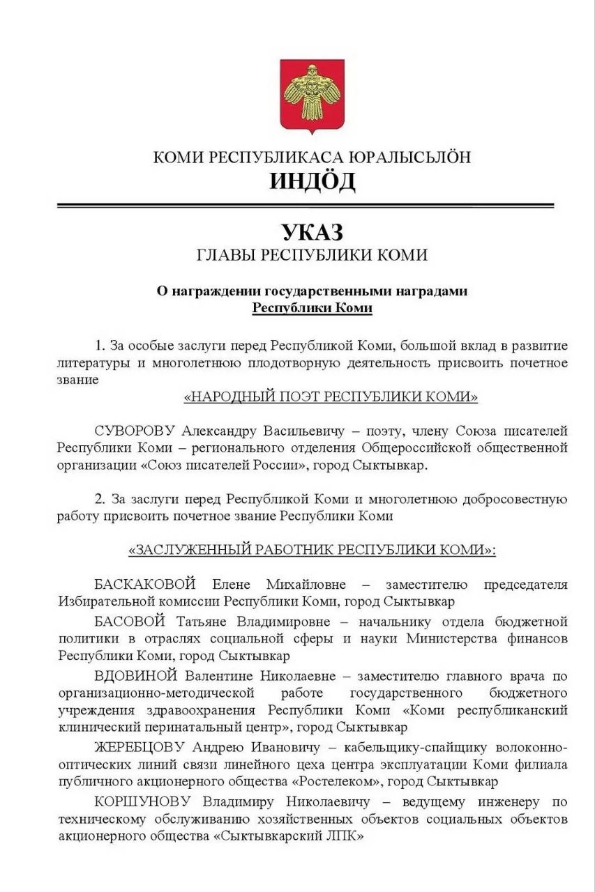 За особые заслуги перед Республикой Коми, большой вклад в развитие литературы и многолетнюю плодотворную деятельность почётное звание «Народный поэт Республики Коми» присвоено Александру Васильевичу Суворову.