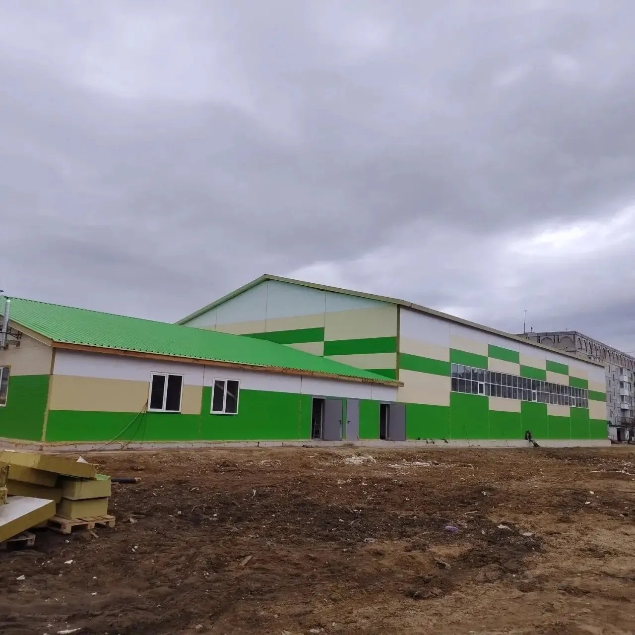 На данный момент у здания уже возведены стены и кровля. Внутри смонтировано отопление и нанесено огнезащитное покрытие. В зале продолжаются работы: подготовка пола, монтаж датчиков пожарной сигнализации, установка фасадных элементов, систем водостока, вентиляции, снегозадержателей и кровельного ограждения.