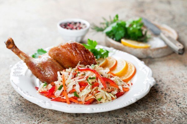 После приготовления подавайте запечённые утиные ножки с лёгким салатом из капусты или гарниром на ваш выбор — кускусом или рисом.