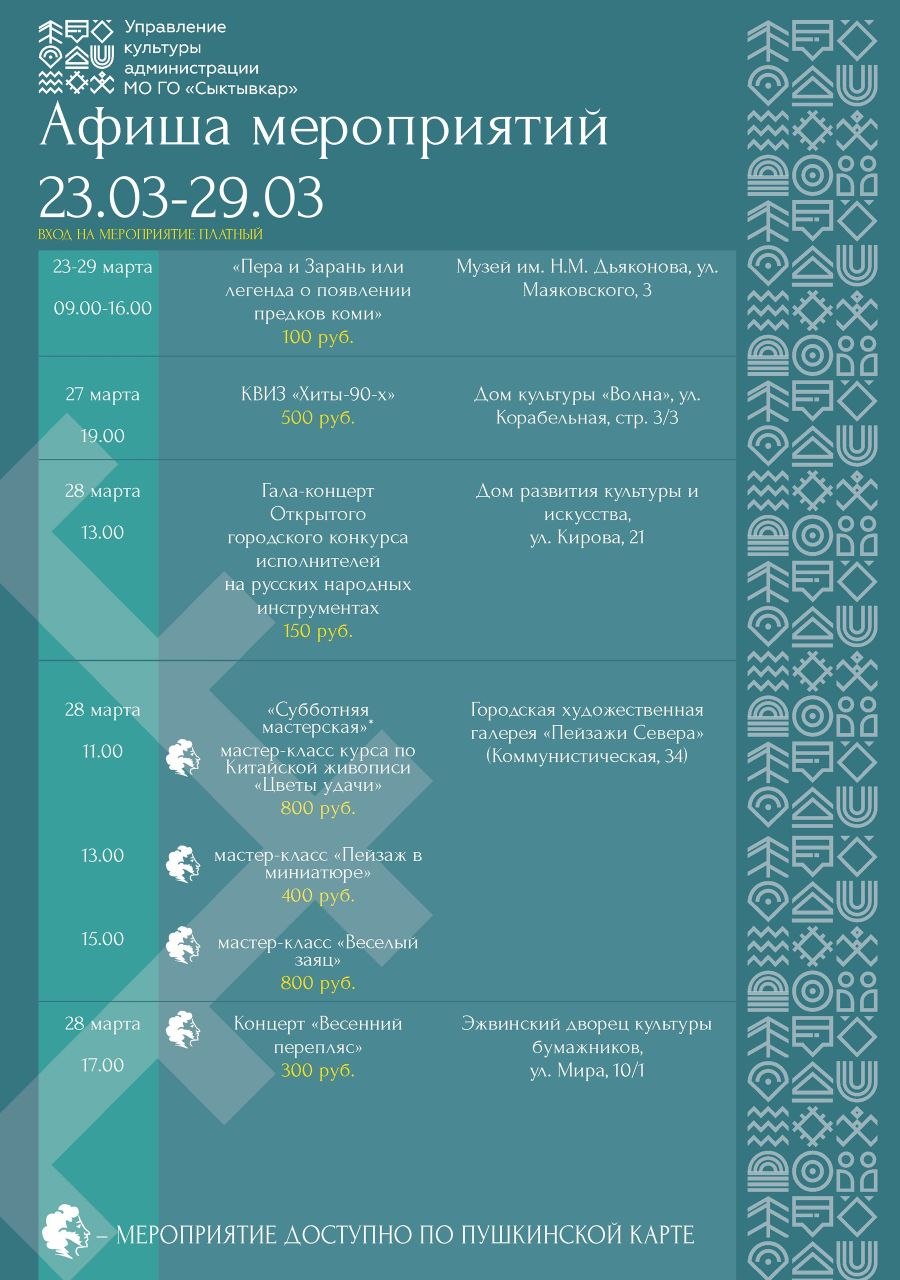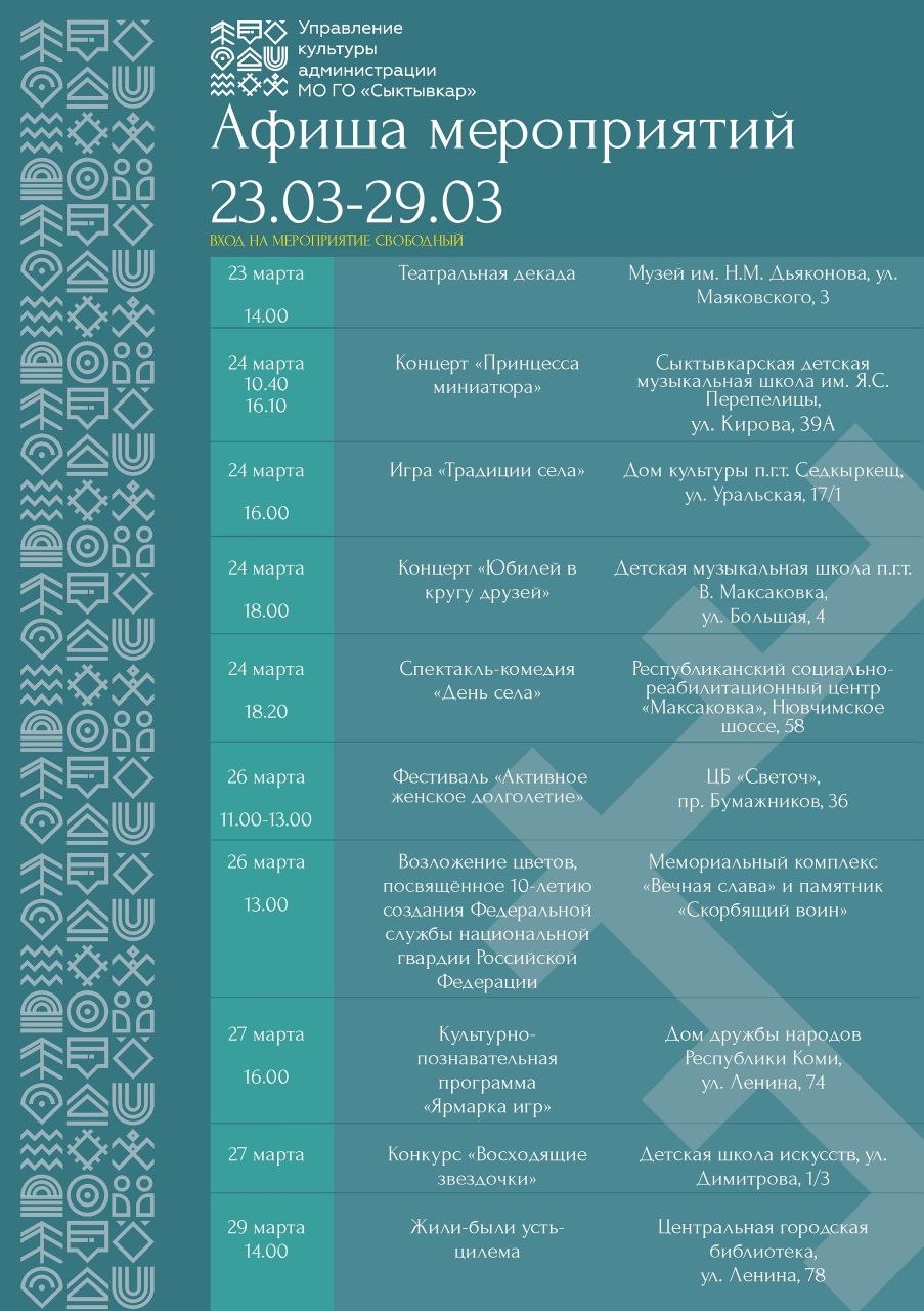 Афиша культурных событий города для вас!Следующая неделя будет яркой, выбирайте мероприятия на свой вкус, планируйте время и проводите его с семьей, детьми или друзьями культурно!#КультурныйСыктывкар
