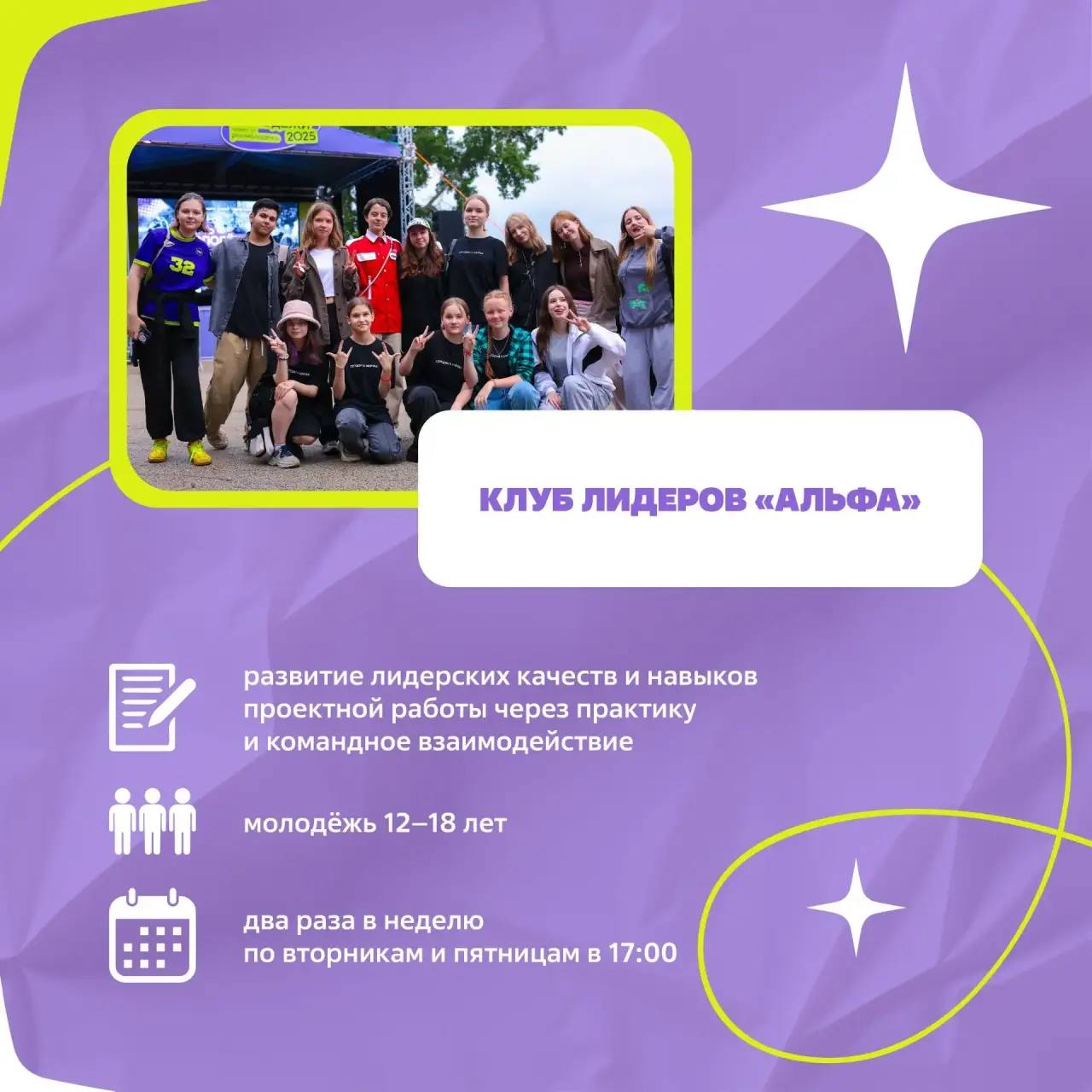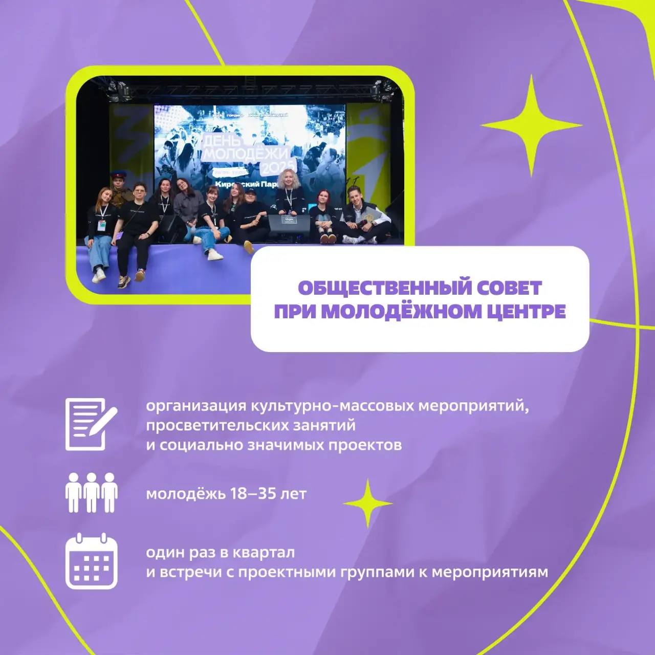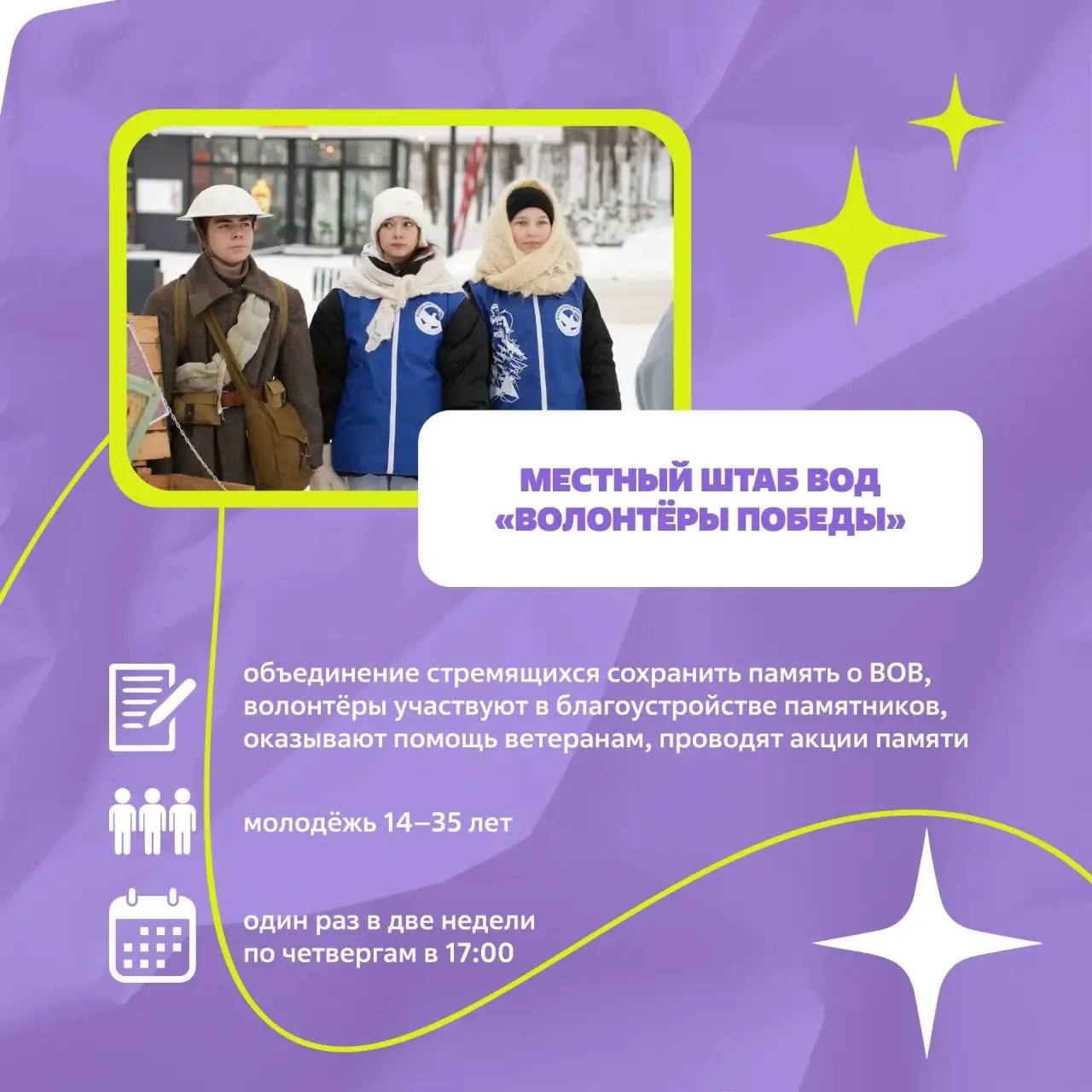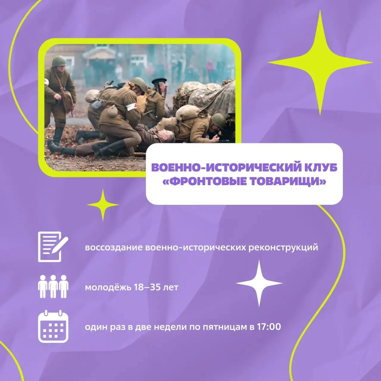 Здесь можно найти занятие по душе: волонтёрство, медиа, историческая реконструкция, социальное проектирование, клубы для молодых семей и многое другое. Все направления - для молодёжи от 12 до 35 лет. Приходите сами, с друзьями, расскажите детям.