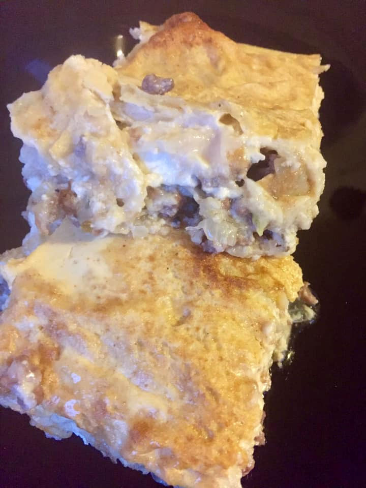 Далее, берется лист лаваша, укладывается на смазанное дно формы, после чего на него кладется слой фарша, затем творог. Слой лаваша (предварительно нарезанного по размеру формы, без бортиков) чередуется с фаршем и творогом. Важно, чтобы верхний слой был из лаваша, и лучше, если слоев будет 4 или больше.