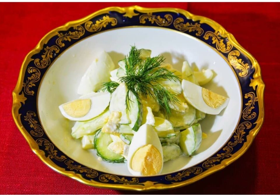 Блюдо дня: салат из яиц с зелёным луком и огурцами.
