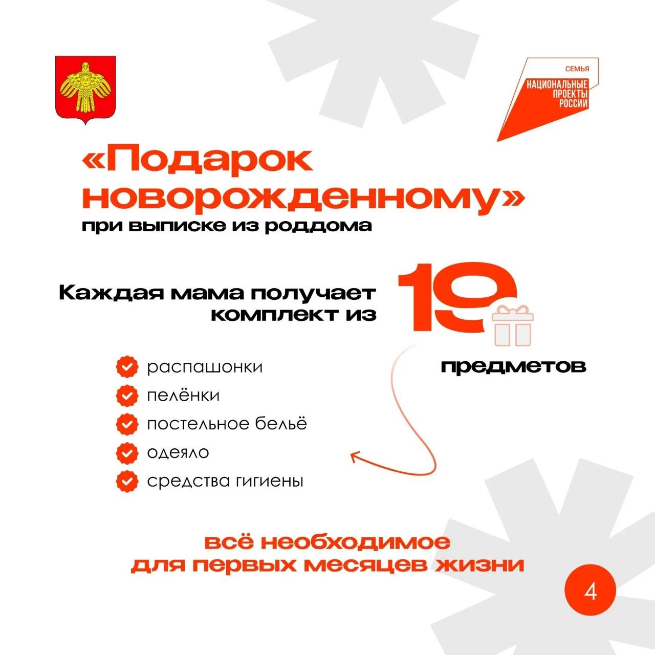 Каждая мама получает комплект из 19 предметов: распашонки, пелёнки, постельное бельё, одеяло, средства гигиены – всё необходимое для первых месяцев жизни.