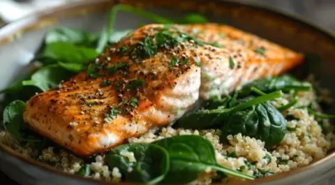 - Лосось с киноа и шпинатом: запеченный лосось приправляют лимонным соком, подают с отварной киноа и обжаренным шпинатом с чесноком, создавая гармоничное сочетание вкусов и пользы.