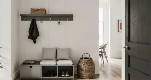 - Входная зона: воспользуйтесь корзинами для перчаток и шарфов, а также вертикальными полками для обуви, чтобы избежать нагромождения.