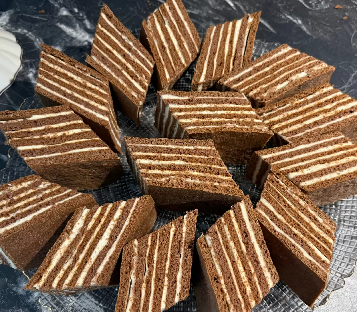 Крем наносится обильно между слоями, верхний корж оставляется без крема, десерт пропитывается несколько часов и нарезается на аккуратные кусочки, идеально подходящие к чаепитию.