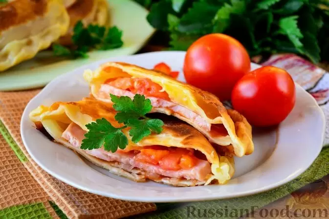 - Лепёшки-пиццы: Сочетание чебуреков и пиццы, создающее взрыв вкуса. Эти хрустящие лепёшки с колбасой, помидорами и сыром приготовятся всего за пару минут на сковороде.