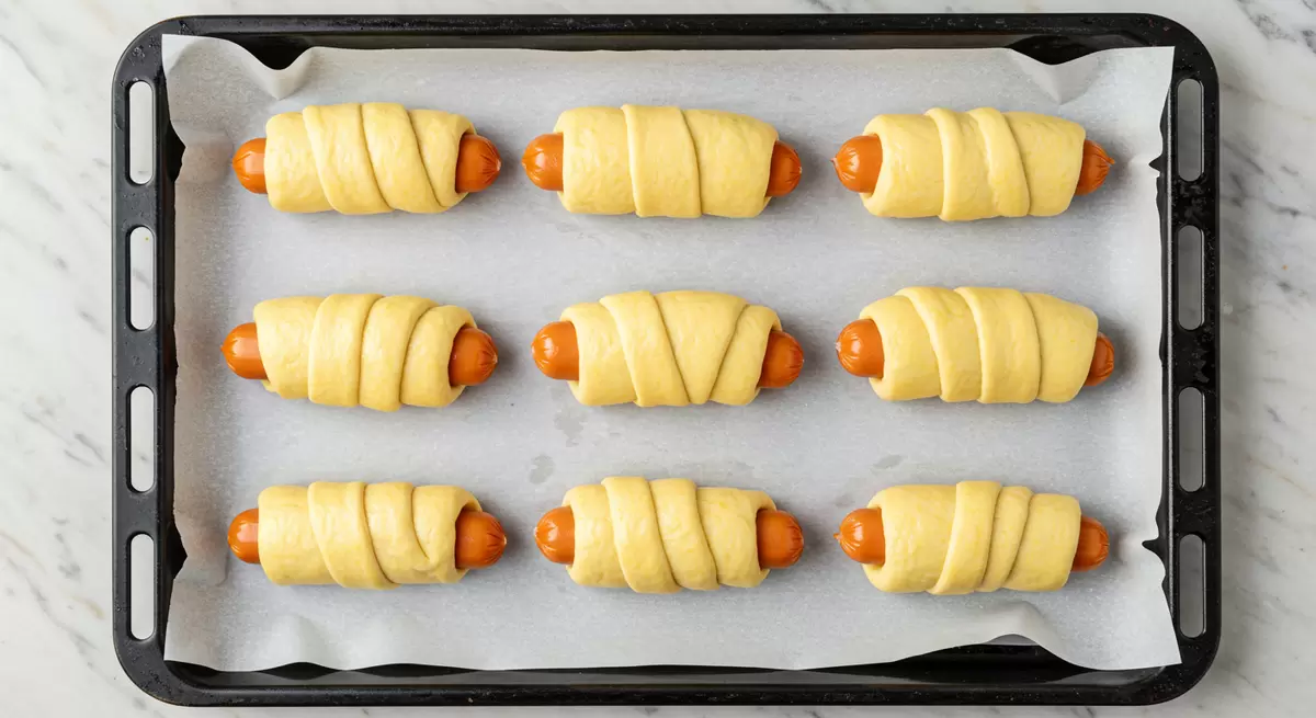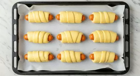 После того как все сосиски завернуты, дайте им немного постоять при комнатной температуре — это позволит тесту подняться и стать более пышным.