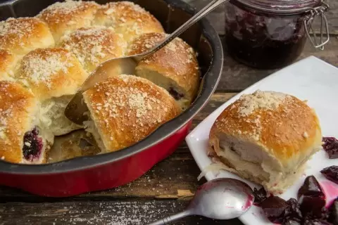 Нежное дрожжевое тесто, которое словно тает во рту, обрамляет сладкую начинку из варенья. Возможность отрывать частички пирога вместо того, чтобы резать его ножом, создает атмосферу уюта и тепла. Каждая «булочка» наполняет помещения своим сладким ароматом во время выпечки, заставляя вас вспомнить о приятных семейных посиделках или беззаботных днях из детства.