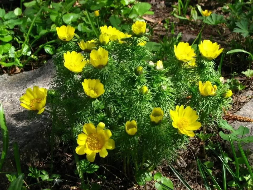 - Адонис весенний (Adonis vernalis) — с нежными желтыми цветами диаметром до 7 см, начинает цвести в конце апреля, словно приветствуя весну.